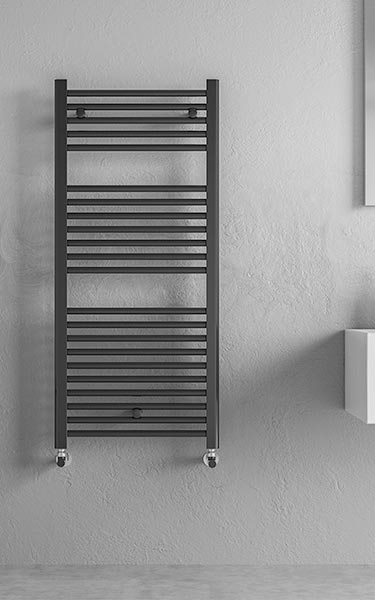 Scaldasalviette da bagno in acciaio con collettori laterali a forma di “D” 40x30 mm e tubo tondo orizzontale dal diametro di 22 mm saldobrasato nelle varianti dritto o curvo. Mensole ovali, tre nella variante dritto, quattro nella variante curvo.