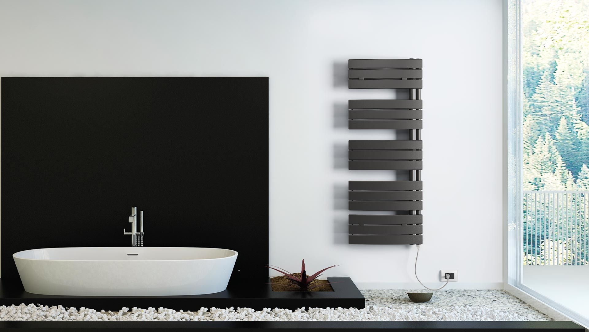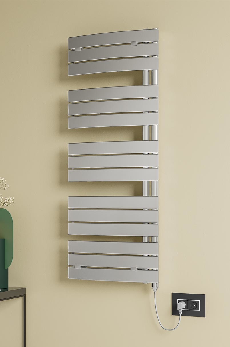 Scaldasalviette da bagno in acciaio con collettori laterali tondi dal diametro di 38 mm e tubo piatto curvo orizzontale 70x11 mm saldobrasato. Quattro mensole rettangolari.